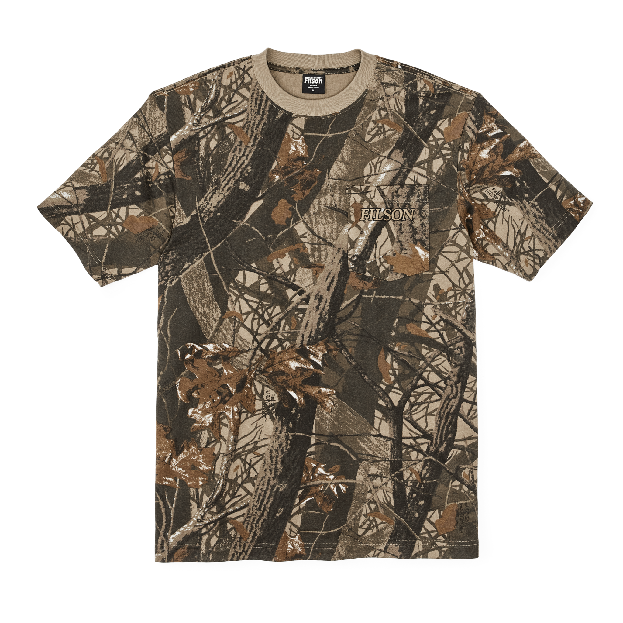 Our Embroidered Pocket T-Shirt is a heavy-duty take on a classic wardrobe staple. made with sturdy 6.5-oz. cotton that’s comfortable in any season. Printed with Realtree? Hardwoods? camouflage. Rib-knit collar for shape retention. Filson logo embroidered on left-chest pocket.